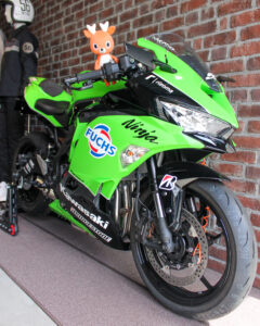 入り口すぐにある、現役時代のカラーリングを再現した特別仕様バイクがみんなをお出迎えしてくれるよ🏍️💚